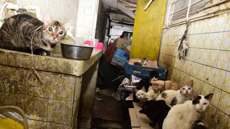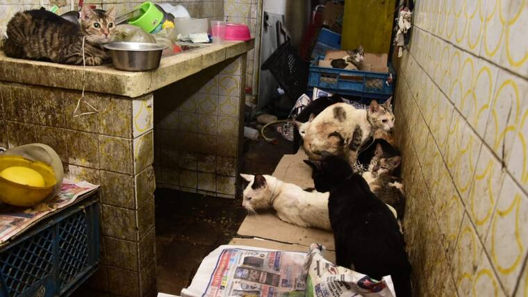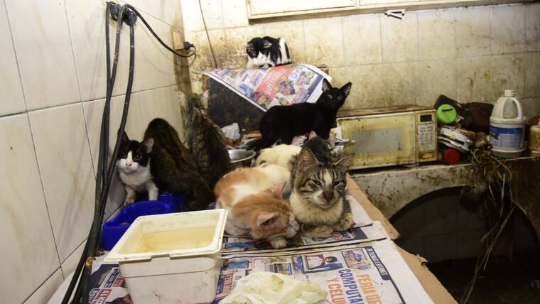 En la cocina se encontraron más de 30 gatos amarrados con nailon en la parte del cuello. Estaban en un estado bastante crítico encima de los mesones y dentro de varias canastas.