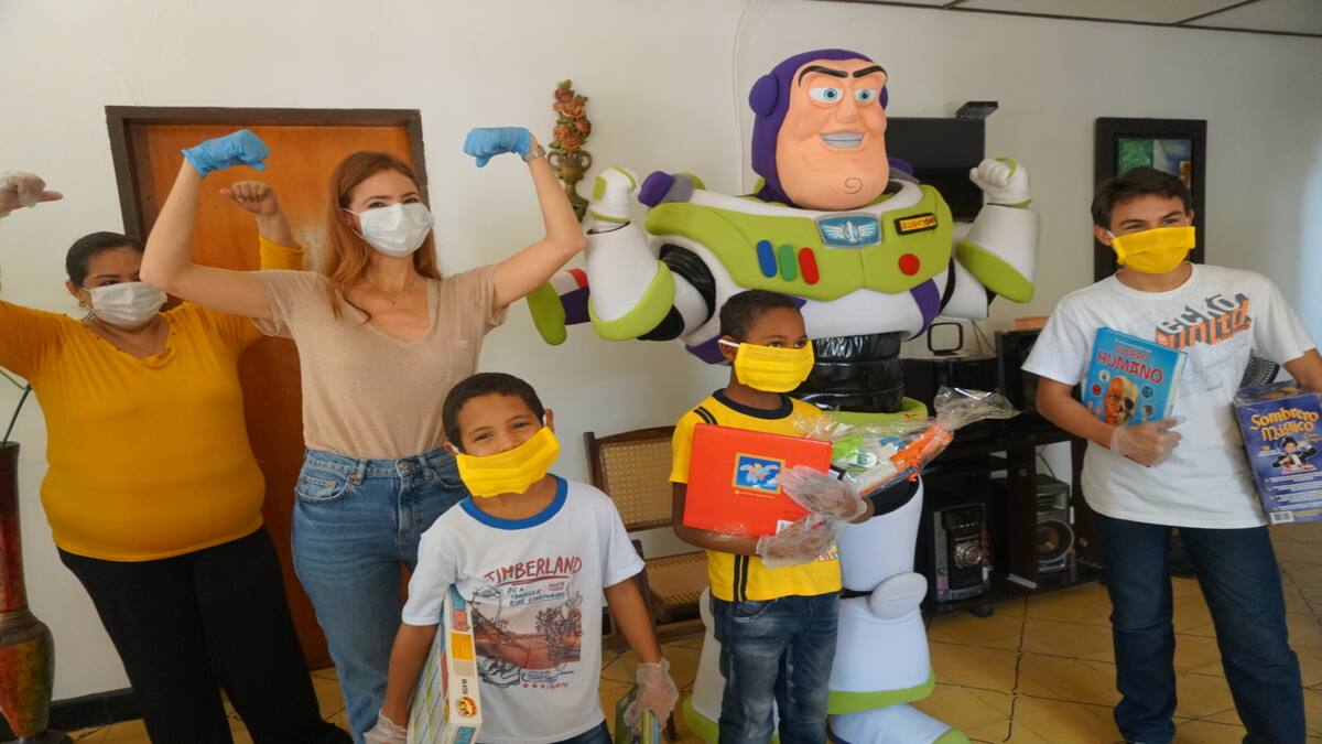 Hoy, los niños del barrio Las Gardenias recibieron la visita de la primera dama, junto a los personajes Valentín y Valentina, de la campaña ‘Casa de Valientes’, para recordar la importancia de mantenerse en casa en medio de la emergencia sanitaria, brindándoles un rato de diversión y aprendizaje.