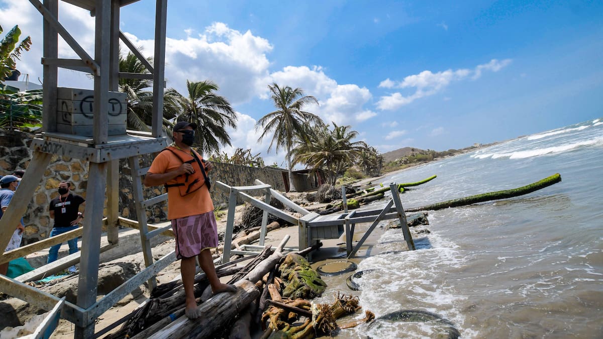 Las aguas se han consumido casi 20 metros de la playa, causando afectaciones en la infraestructura de algunos comercios. Incluso, ha tumbado palmeras mientras que las torres de salvavidas han quedado en la orilla junto a pilas de basuras y palos de maderas que llegan procedentes del río Magdalena.