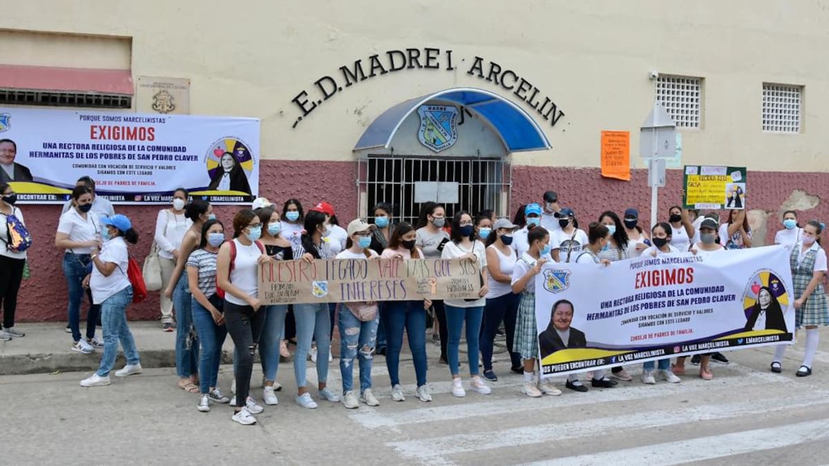 Padres de familia y estudiantes de la Institución Educativa Distrital Madre Marcelina realizaron en la mañana de este lunes un plantón pacífico en las afueras del colegio para exigir que la rectoría sea asumida por una persona perteneciente a la comunidad religiosa Hermanitas de los pobres de San Pedro Claver, y no por un laico.