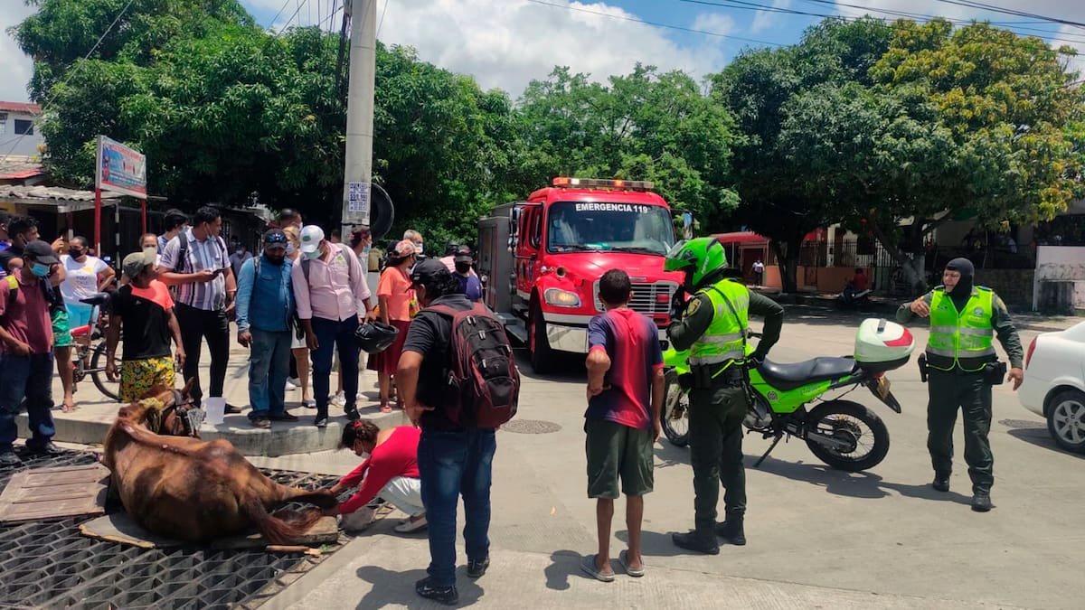 'El dueño del caballo se detuvo en la esquina a echarle aire a una de las llantas del carro de mula y entonces dejó al caballo solo mientras iba a buscar la manguera de aire y el caballo se espantó en ese momento por los carros y al pasar por las rejillas se quedó atascado', indicó a Wasapea a EL HERALDO una de las personas que presenció el accidente.