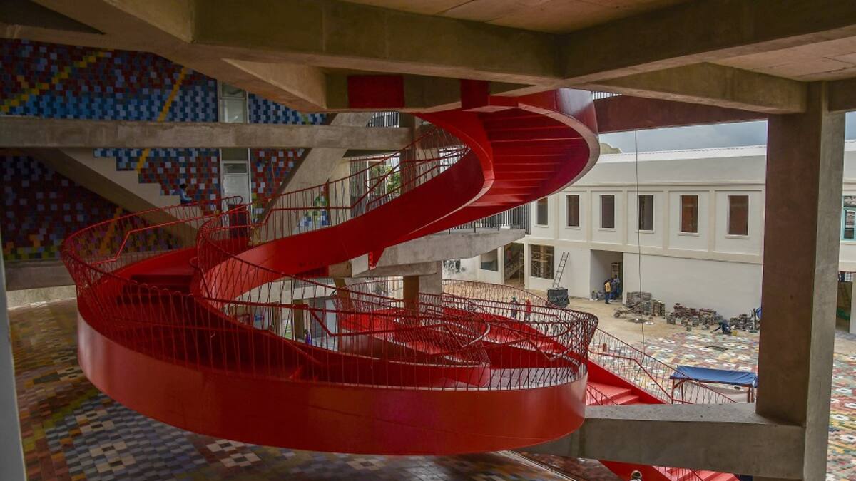 Su arquitectura funcional es el resultado de las necesidades del recinto. Una escalera escultórica roja en forma de hélice es un eje atractivo de la infraestructura.