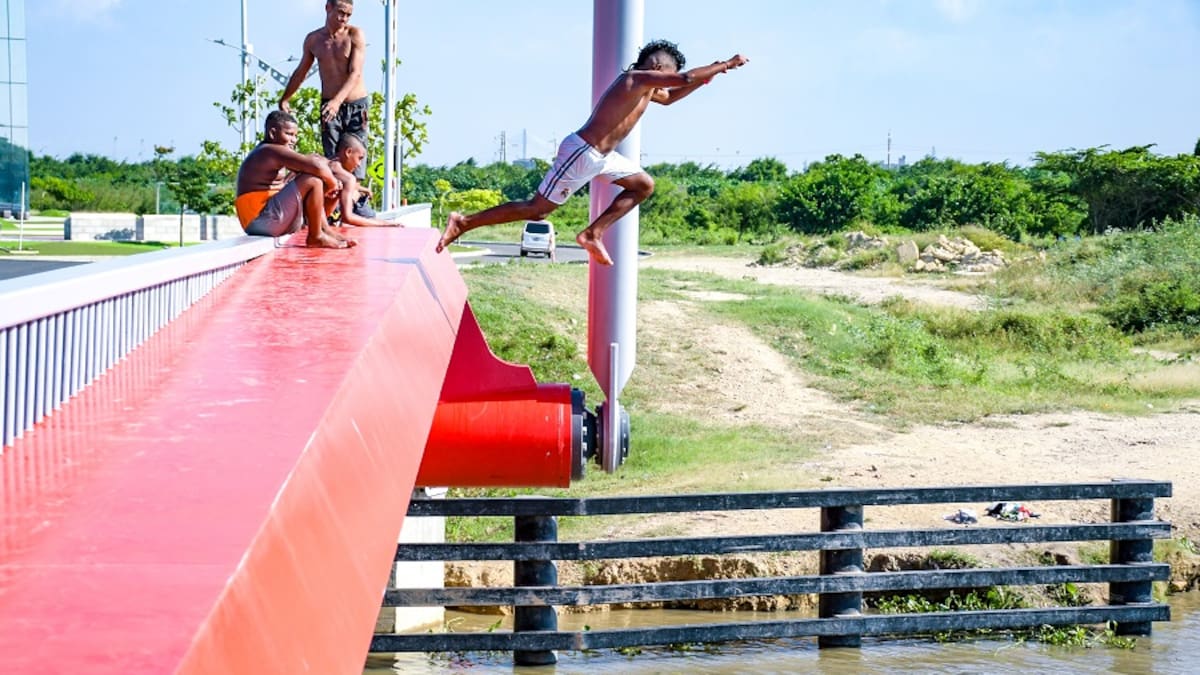 El recién inaugurado puente batiente ha sido convertido –por un grupo de jóvenes residentes en los barrios La Loma y La Bendición de Dios, entre otros– en un 'peligroso trampolín' para zambullirse a las aguas del Caño Las Compañías.
