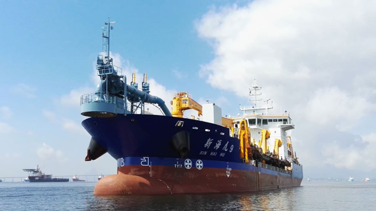 La draga Xin Hai Hu 9, de bandera china, tiene capacidad de tolva de 10.000 metros cúbicos, profundidad neta o real de trabajo de 35 metros, calado máximo en condiciones de operación de 8,2 metros, calado mínimo en condiciones de operación de 4,8 metros, eslora de 130,3 metros y manga de 25,6 metros.