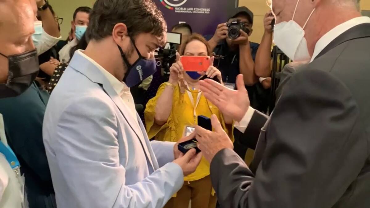 En el marco del inicio del Congreso Mundial de Juristas 2021, el alcalde de Barranquilla, Jaime Pumarejo durante una conversación con el alcalde de Lima, Jorge Muñoz, recibió una medalla del Bicentenario que fue entregada a los alcaldes.