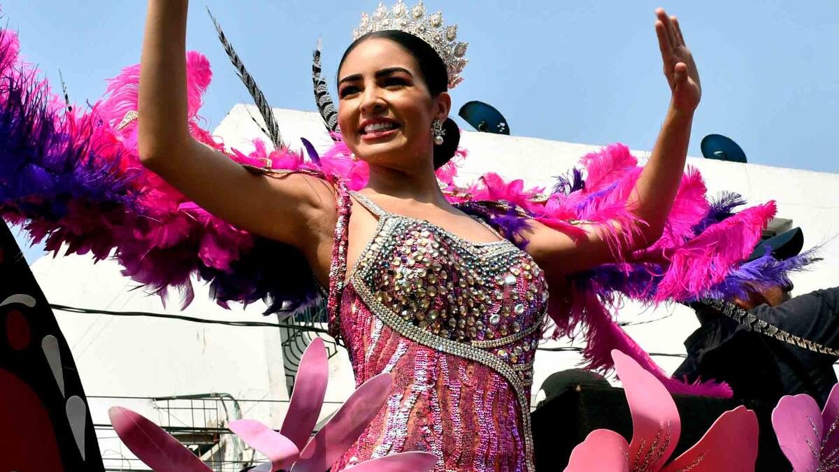 La soberana de la 44, Paula Sarmiento, cumplió la cita con sus 'paisanos' en el bordillo. Con un traje bordado en canutillos, lentejuelas y pedrería rosada y plateada, con un gran aparejo fucsia y morado de plumas, la reina del Carnaval de la 44 enamoró a los espectadores del ‘desfile del bordillo’, que desde temprano anhelaban su llegada.