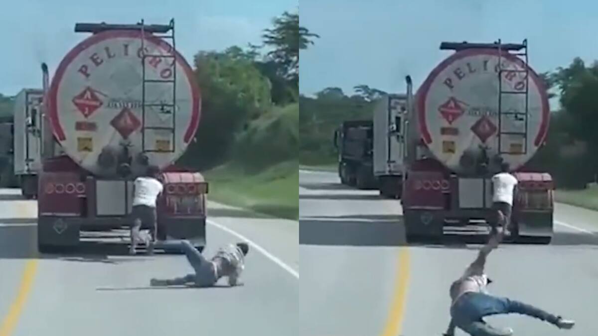 Con el objetivo de transportarse a su lugar de destino, los individuos se sujetaron de la parte trasera del camión que transportaba combustible sin que el conductor se diera por enterado.