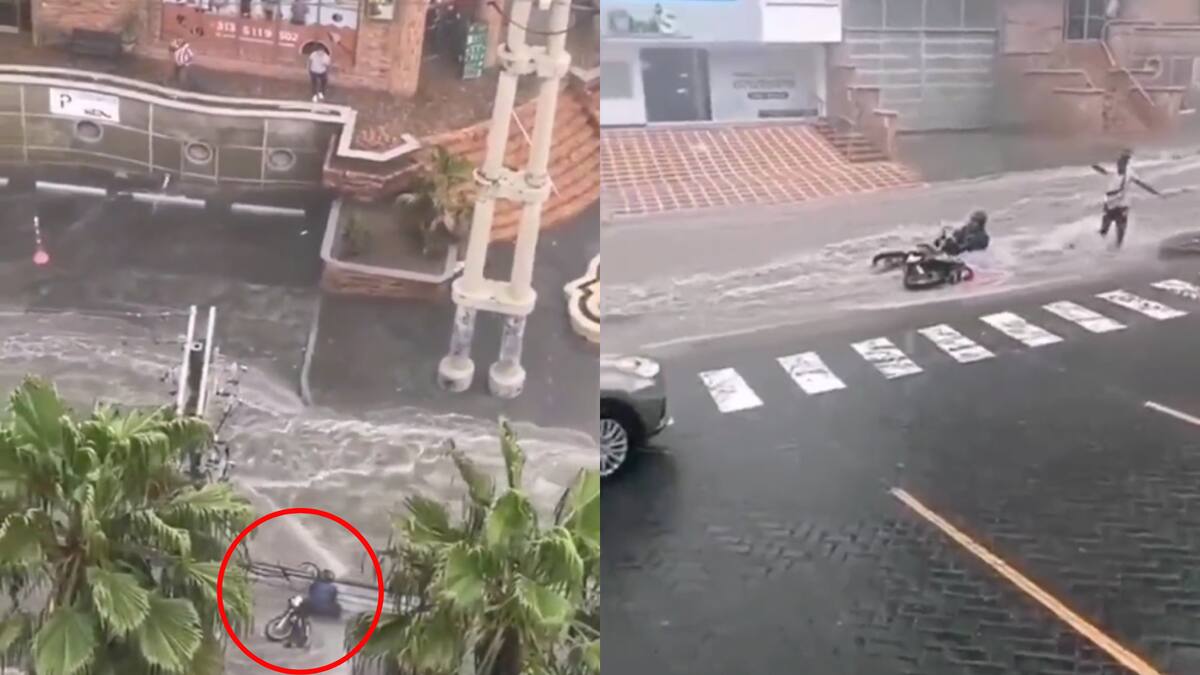 En el clip de 45 segundos, se ve al conductor de la moto intentar cruzar el arroyo, a pesar de que se percató que estaba crecido. El hombre se dispuso a cruzar la esquina de la calle 85 con carrera 46 y cuando casi lograba su cometido, perdió el equilibrio del automotor y cayó a la corriente del agua.