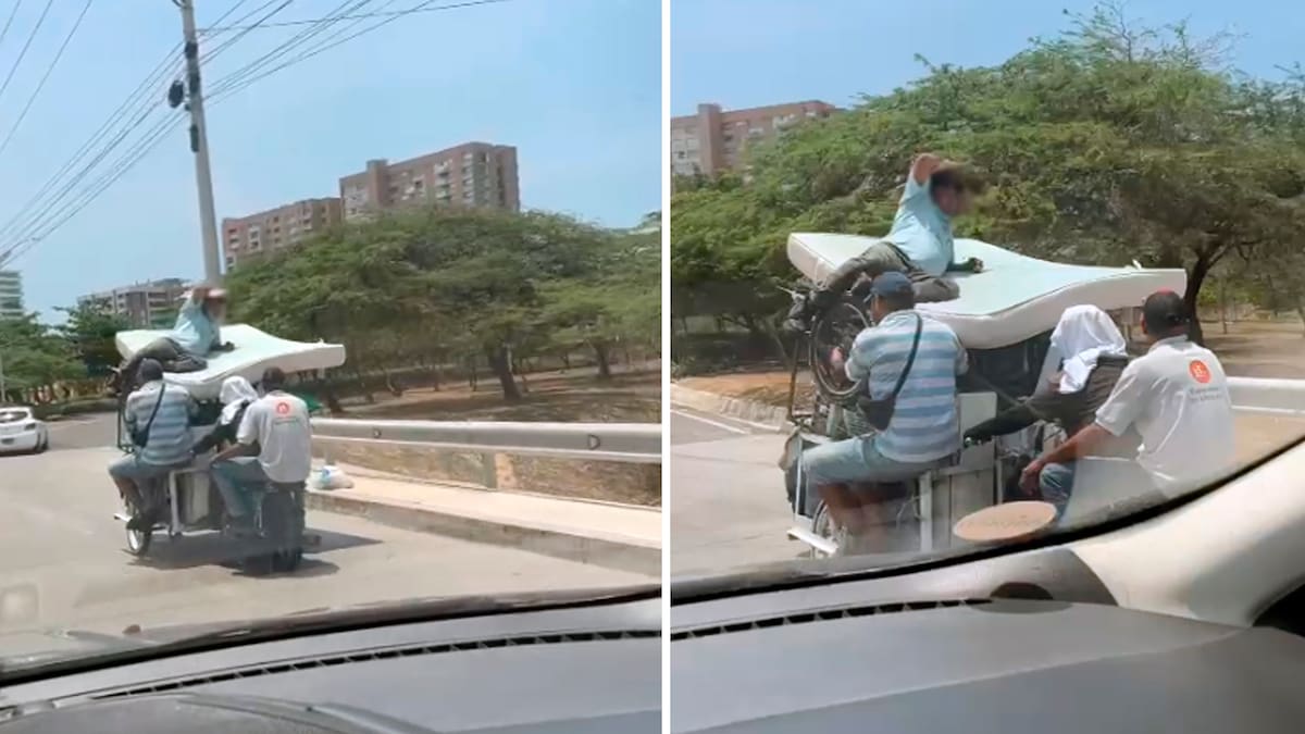 En las imágenes se aprecia cómo un hombre conduce un motocarro, mientras transporta diferentes elementos que le obstaculizan la vista de la vía. Pero adicional a eso hay otra persona en el vehículo, pero este se encuentra sobre un colchón en lo alto de los enseres que movilizan.