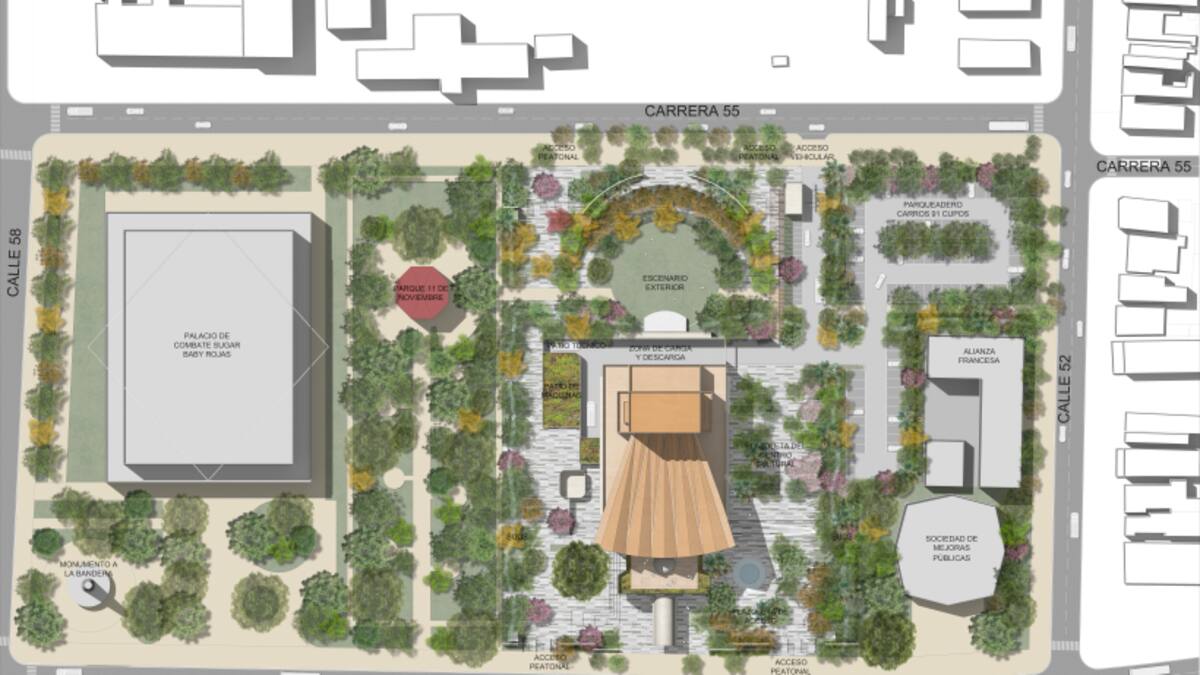 Para el espacio externo estará rodeado de plazas y parques con una amplia zona verde que estará integrada al Parque 11 de Noviembre, con una pequeña área de estacionamientos y un teatro al aire libre dentro de jardines.