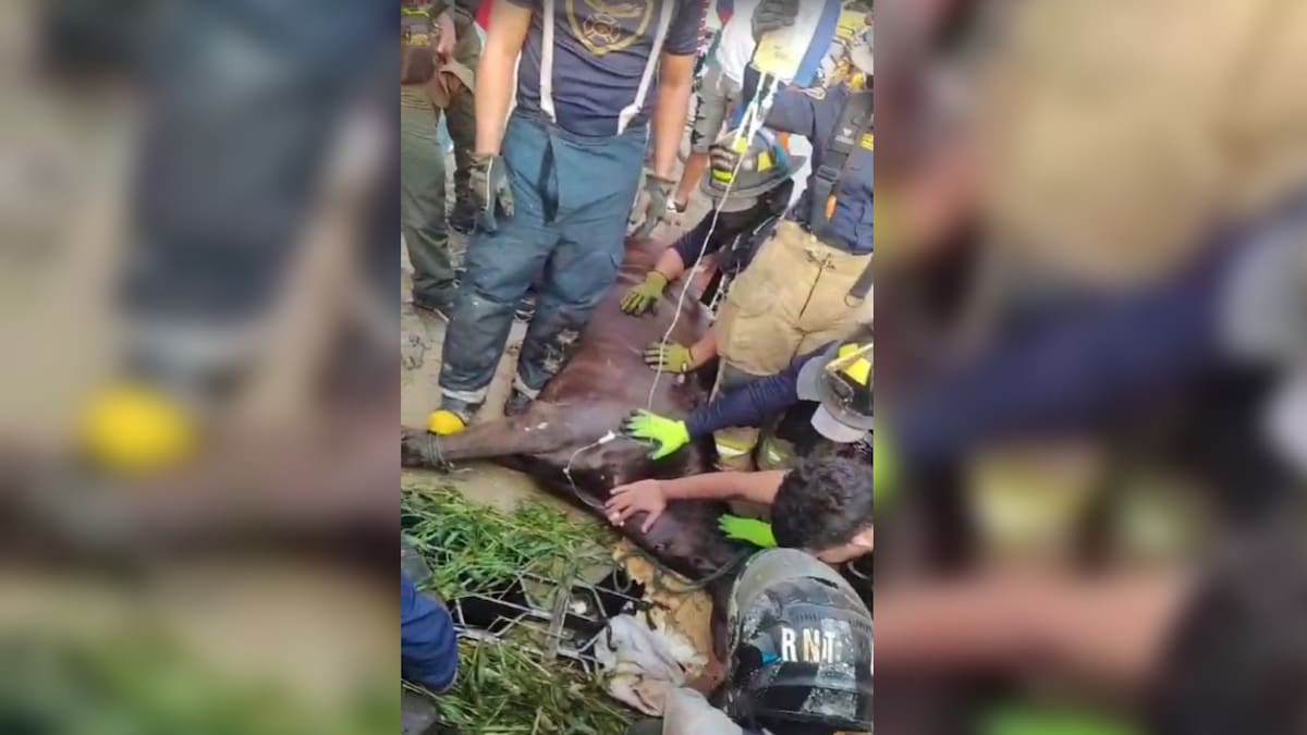 En la misma grabación, se observa además a los miembros del cuerpo de bomberos con todos los equipos para estabilizar al animal y horas más tarde, lo lograron sacaron de la zona.