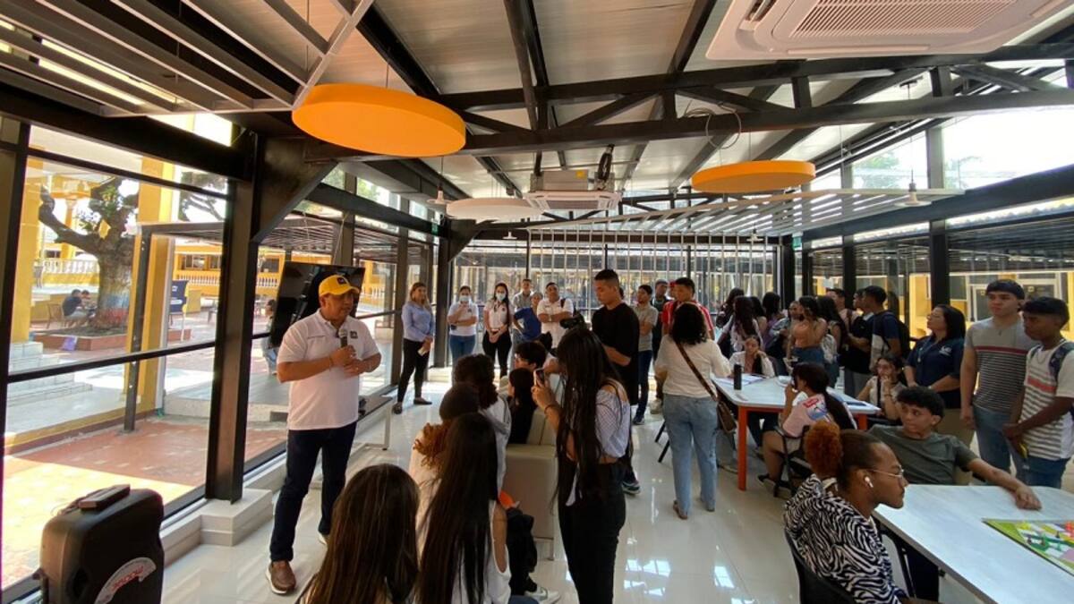 Se trata del nuevo Salón Creativo, el propio Cubo de Cristal de la Institución Universitaria de Barranquilla. Un espacio destinado para el descanso, recreación y esparcimiento, que surge como estrategia para la mejora de las condiciones de bienestar de la comunidad institucional para que los estudiantes puedan desestresarse, descansar y hacer pausas en medio de las jornadas académicas.