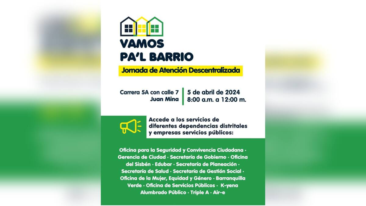 Este viernes 5 de abril la atención es en Juan Mina con la oferta institucional de la Alcaldía de Barranquilla a través de sus diferentes dependencias distritales, en compañía de empresas de servicios públicos y otras entidades.