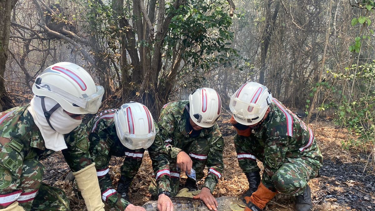 En medio de las llamas que han consumido cerca de 40 hectáreas en el Vía Parque isla Salamanca, un caimán de anteojos fue rescatado por uniformados del Batallón de Ingenieros de Atención y Prevención de Desastres No. 81.