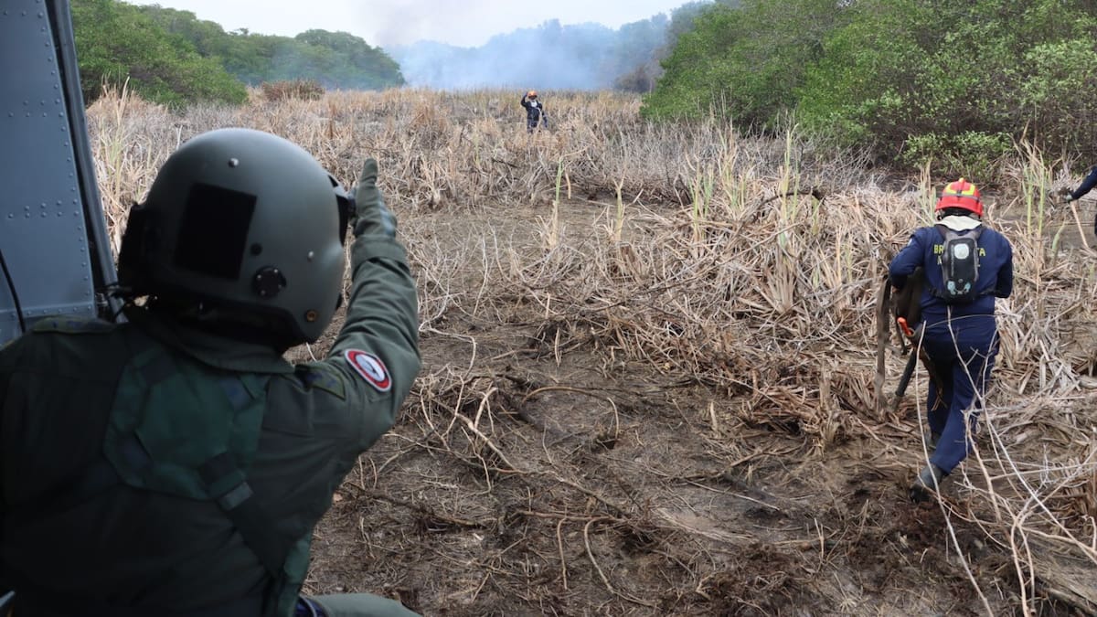 Por tierra y aire continúan las labores para controlar el incendio que ha consumido cerca de 45 hectáreas de mangles y bosque seco tropical en el Vía Parque Isla Salamanca.