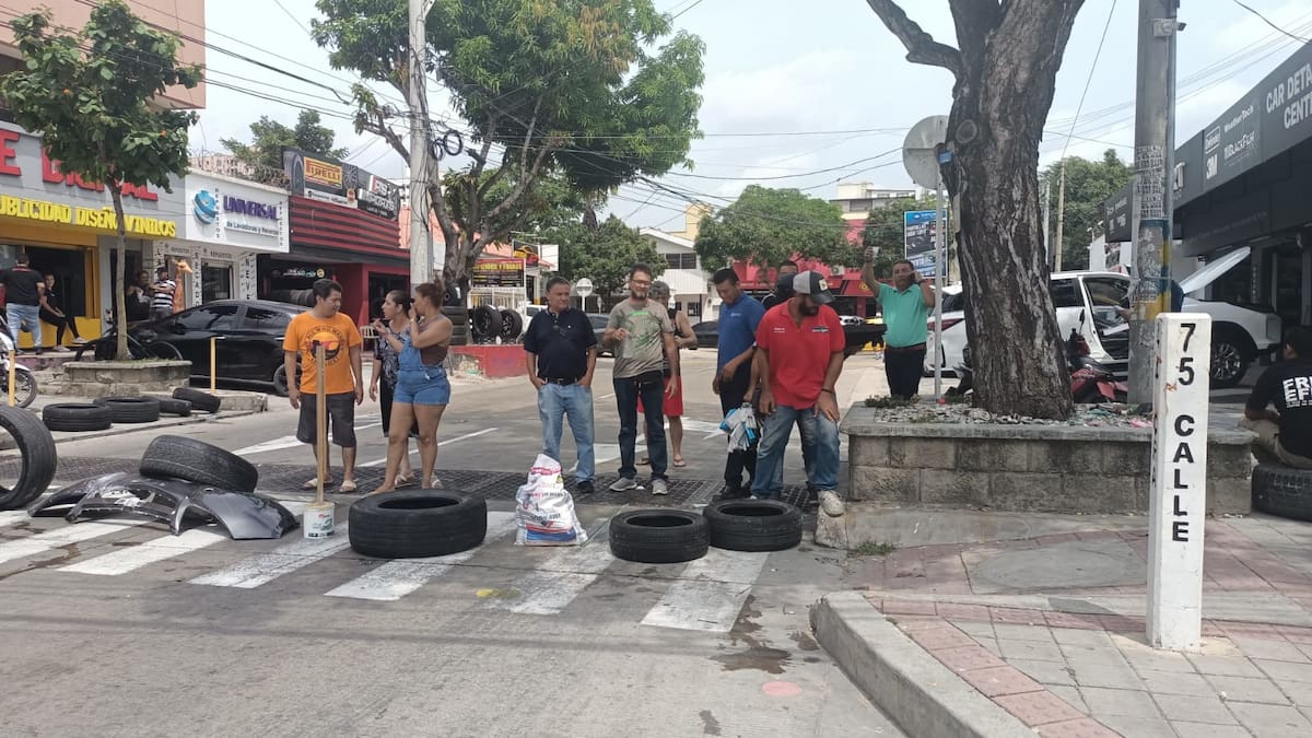 Con palos, llantas y otros elementos, vecinos del barrio Boston bloquean desde la primera hora de la mañana de este jueves 22 de agosto la carrera 44 entre calles 75B y 74 para exigirle a la empresa de energía Air-e el restablecimiento del servicio.