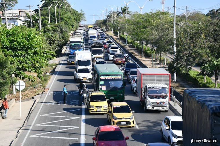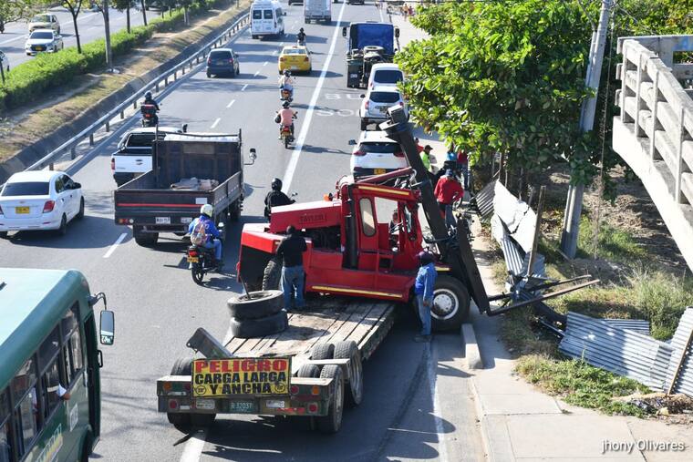 En la tarde de este sábado 25 de enero se presentó un trancón en la avenida Circunvalar, a la altura del puente peatonal del barrio Siete de Abril, debido al choque de un montacargas, que era transportado en una cama baja, con la estructura superior del puente en el sentido sur-norte.
