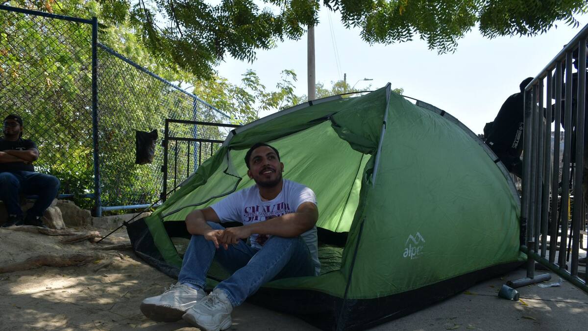 El sol del mediodía ya comenzó a hacer sentir su rigor, pero como si fuera una caricia la fuerte brisa de esta época del año los mantiene combatientes al lados de la dos carpas, una verde y otra rojiblanca, donde se resguardan para la espera y donde pasarán la noche.