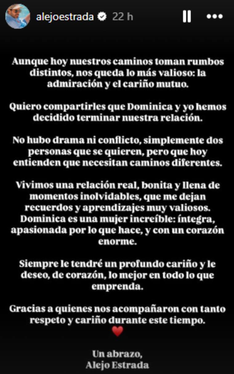 Finalmente, el actor expresó sus buenos deseos para Dominica y agradeció a quienes los apoyaron durante la relación.
