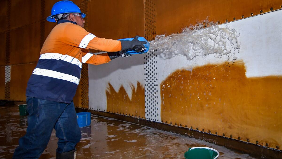 Además, las paredes internas del tanque están siendo lavadas a fondo para eliminar el biofilm, una capa biológica que, aunque es normal en estas infraestructuras, debe removerse periódicamente para mantener estándares de calidad.