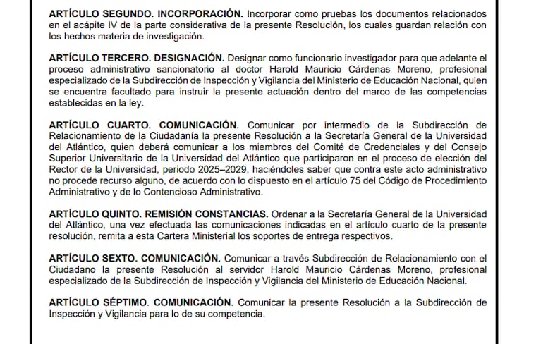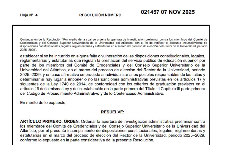 “Se ordena la apertura de investigación preliminar contra los miembros del Comité de Credenciales y del Consejo Superior Universitario de la Universidad del Atlántico, con el fin de verificar el presunto incumplimiento de disposiciones constitucionales, legales, reglamentarias y estatutarias en el marco del proceso de elección del Rector de la Universidad, periodo 2025–2029″, se lee al inicio de la resolución 021457.