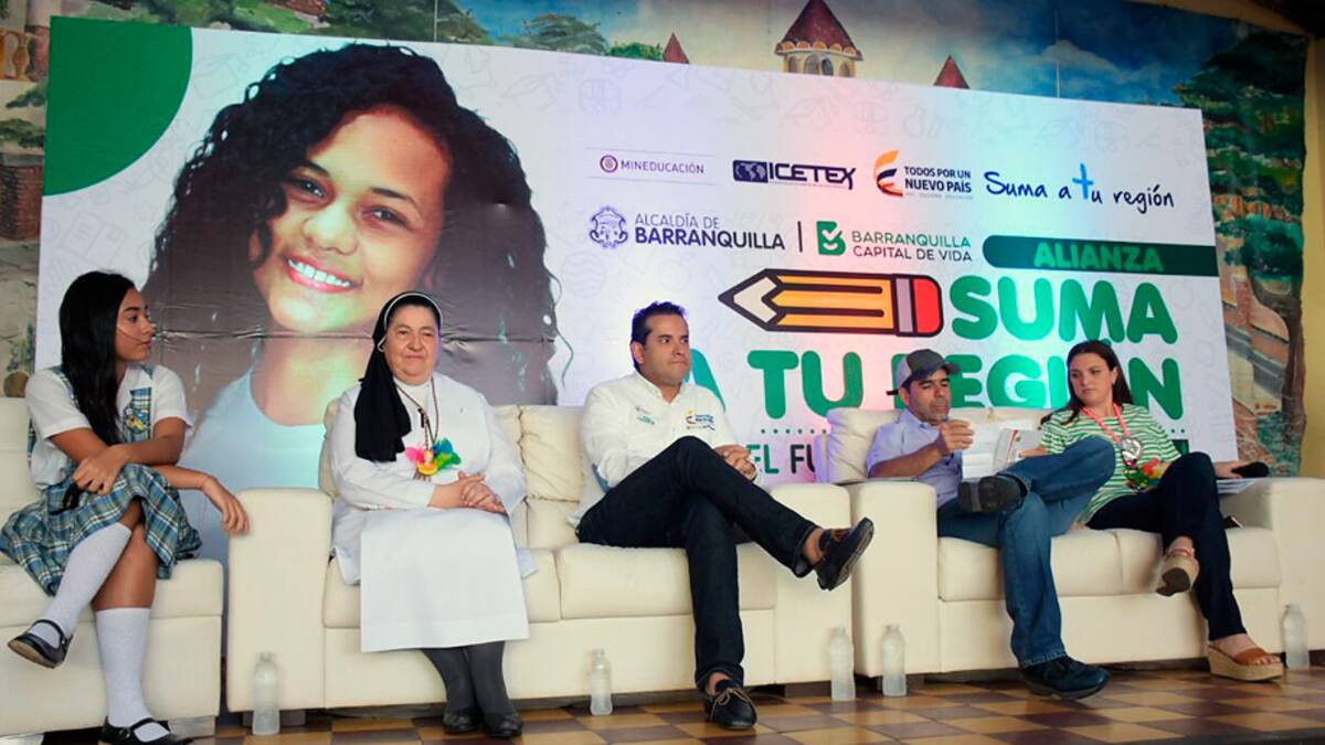 La alianza Suma a tu Región para Barranquilla fue presentada en la Institución Educativa Distrital Madre Marcelina, en un encuentro liderado por el presidente del Icetex, Andrés Vásquez, el alcalde Alejandro Char, y la Secretaria de Educación del Distrito, Karen Abudinen.