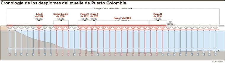 El primer pedazo que se tragó el agua, el 7 de marzo de 2009, medía 200 metros. El 9 de marzo y 26 de noviembre de 2012 se cayeron 50 más en cada ocasión; en julio del mismo año se partieron 20 metros, y para diciembre el muelle ya estaba dividido en cuatro partes. En el 2015 se sumaron 70 metros entre enero y marzo, hasta la destrucción del 2016. (Ver infografía)