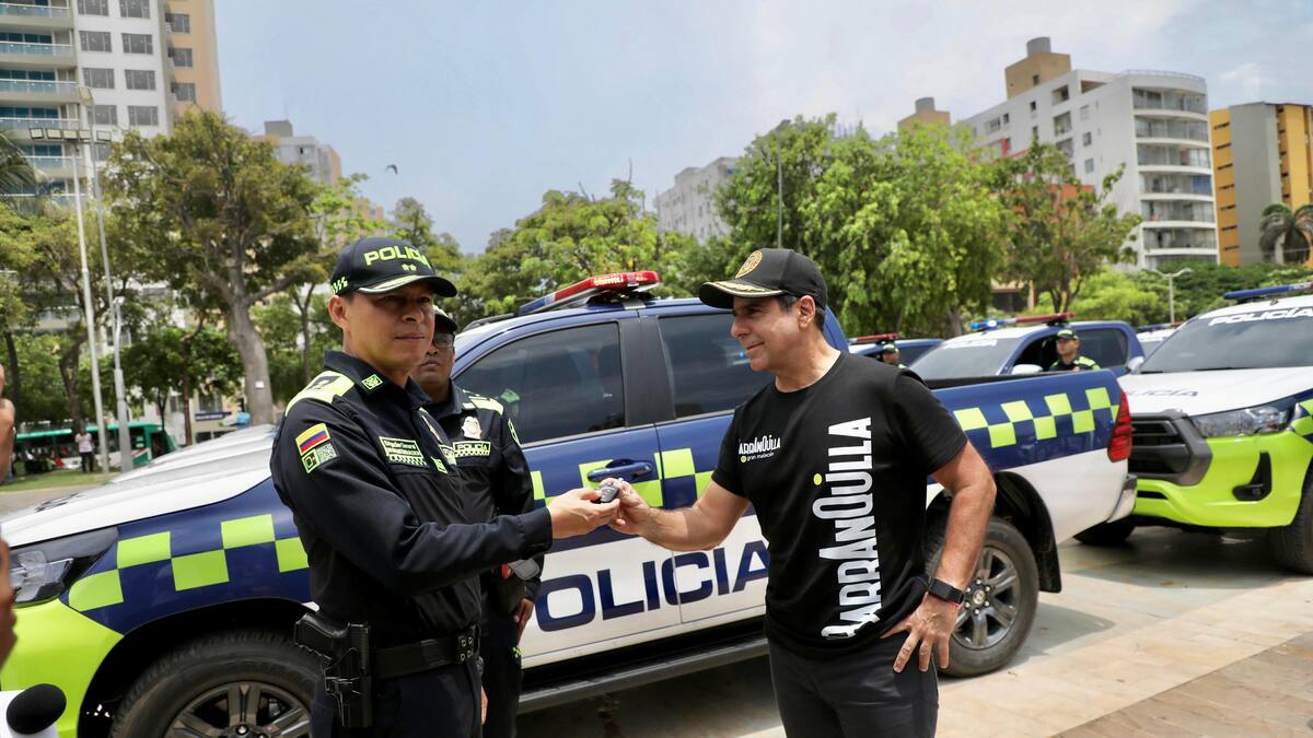 El alcalde Alejandro Char hizo entrega este martes de un CAI blindado en el barrio Santa María y de 40 camionetas nuevas a la Policía Metropolitana de Barranquilla para seguir fortaleciendo la seguridad en la ciudad.