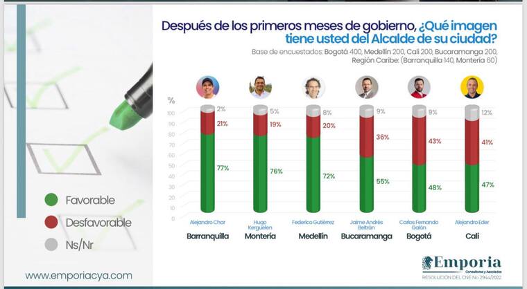 Con un 77% de imagen favorable entre los encuestados, el alcalde de Barranquilla, Alejandro Char, es el mandatario con mejor calificado según la encuesta de la firma Emporya.