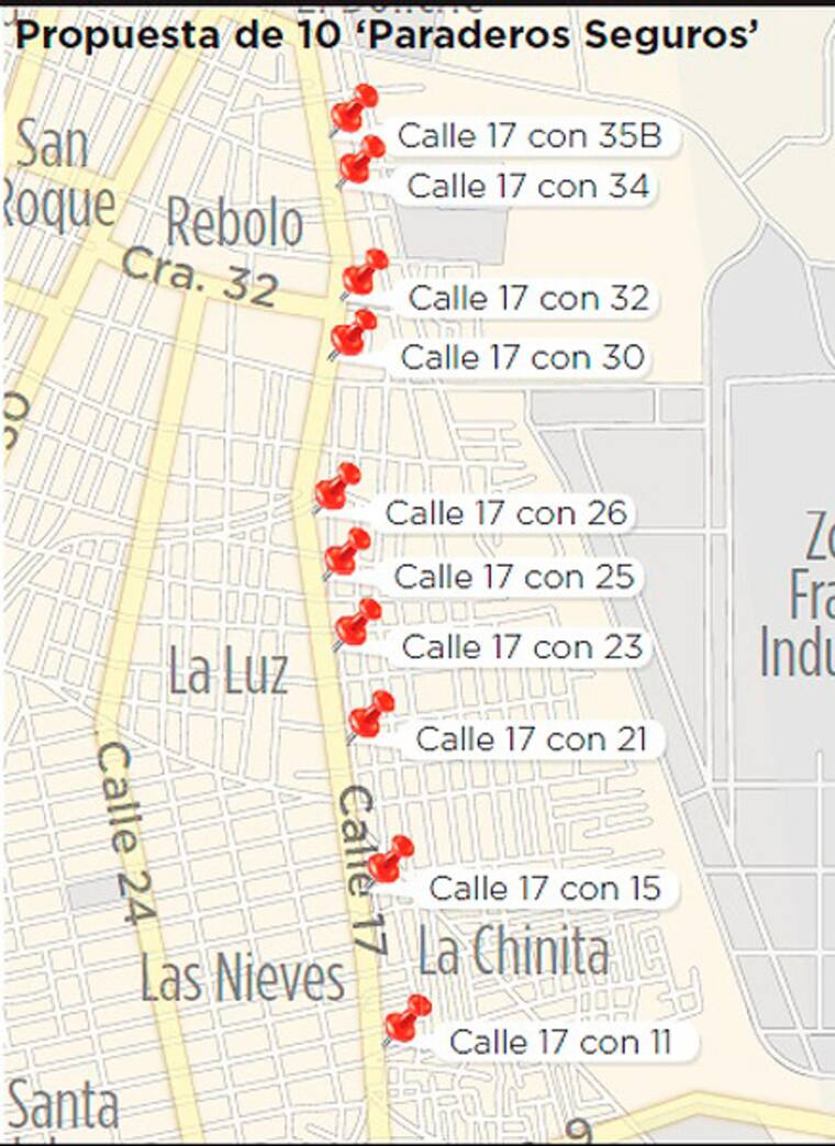 El director del Área Metropolitana de Barranquilla (AMB), Jaime Berdugo, aseguró que la propuesta inicial es que los paraderos estén ubicados entre las carreras 11 (puesto de salud de la Chinita) y 35B (Comando de Acción Inmediata –CAI– Tres Postes). 'Son 10 puntos sobre la 17. Tuvimos en cuenta que coincidieran con el tema de la ubicación de CAI y cámaras de vídeo vigilancia. Aún estamos en la fase de confección del proyecto'.