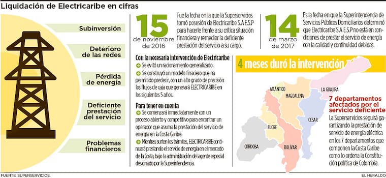 El futuro de Electricaribe fue sentenciado este martes por la Superintendencia de Servicios Públicos Domiciliarios. La toma de posesión de la compañía, que se inició el 15 de noviembre de 2016, ahora es con 'fines liquidatorios', según la Resolución 20171000005985 firmada por el superintendente José Miguel Mendoza el día de ayer.
