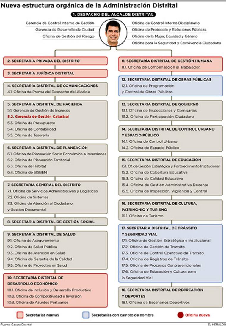 Con la modificación en la estructura se crearon cuatro Secretarías nuevas: Secretaría Privada del Distrito, Secretaría de Comunicación, Secretaría de Desarrollo Económico y Secretaría de Gestión Humana. A su vez, dos de estas cambiaron de nombre. La Secretaría de Infraestructura será ahora Secretaría de Obras Públicas, que tendrá una nueva dependencia denominada oficina de Programación y Control de Obras Públicas, y la Secretaría de Movilidad será de Tránsito y Seguridad Vial.