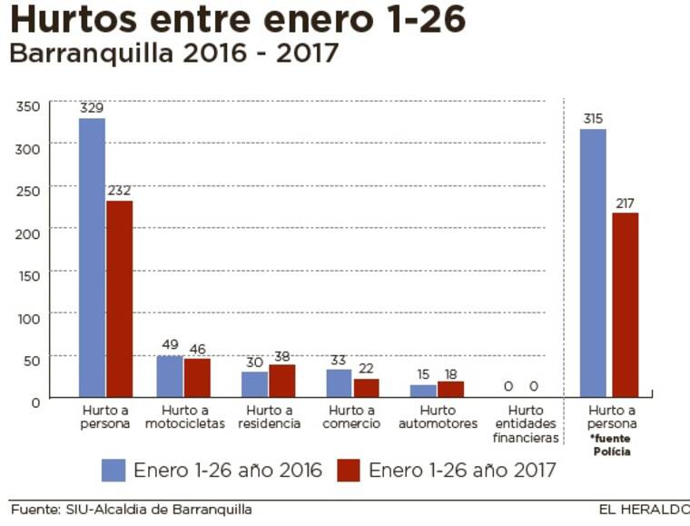 La Alcaldía de Barranquilla registró entre el primero y el 26 enero 356 casos de robos, a través del Sistema Unificado de Información de Seguridad Ciudadana (SIU). Representó un 22% menos al compararlo con el mismo lapso del año anterior, cuando reportaron 456 hechos asociados a este delito.