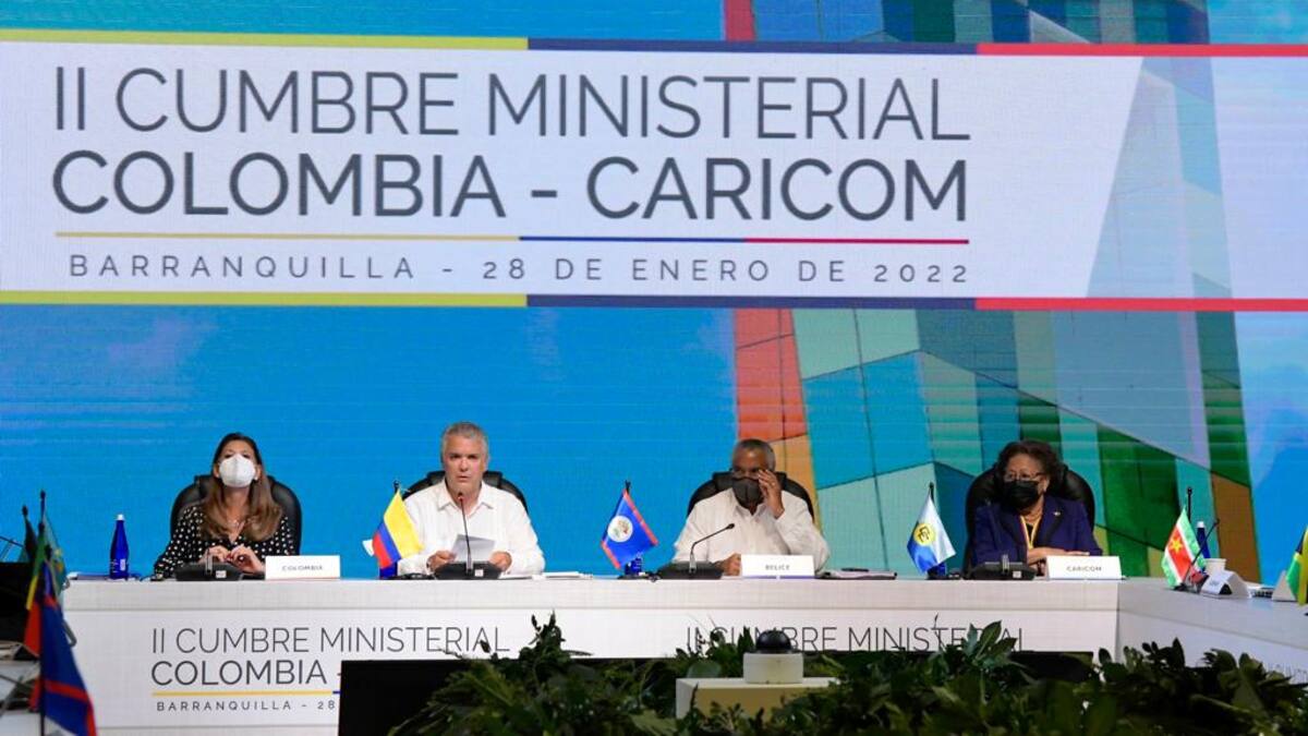 'Es honor recibirlos acá en Colombia y en Barranquilla. Colombia es un país que tiene presencia importante en el Caribe por todos los acuerdos históricos que tiene con los países de la región. Nunca olvidaremos la ayuda que recibimos del proceso independentista', dijo Duque al inicio de su intervención.