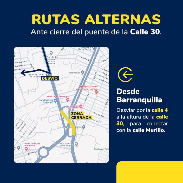 De acuerdo con lo informado por el teniente coronel Julio Olaya, jefe seccional de tránsito de Barranquilla, se están habilitando como rutas alternativas para las personas que requieran salir o ingresar al municipio de Soledad o al aeropuerto Ernesto Cortissoz. Se trata de la Circunvalar con la glorieta, la bifurcación de la calle 30 hacia el barrio Simón Bolívar, y la calle 30 con las carreras 2 o la 4, esto con el propósito de descongestionar el tráfico acumulado producto del colapso de la estructura sobre la vía hacia el aeropuerto.