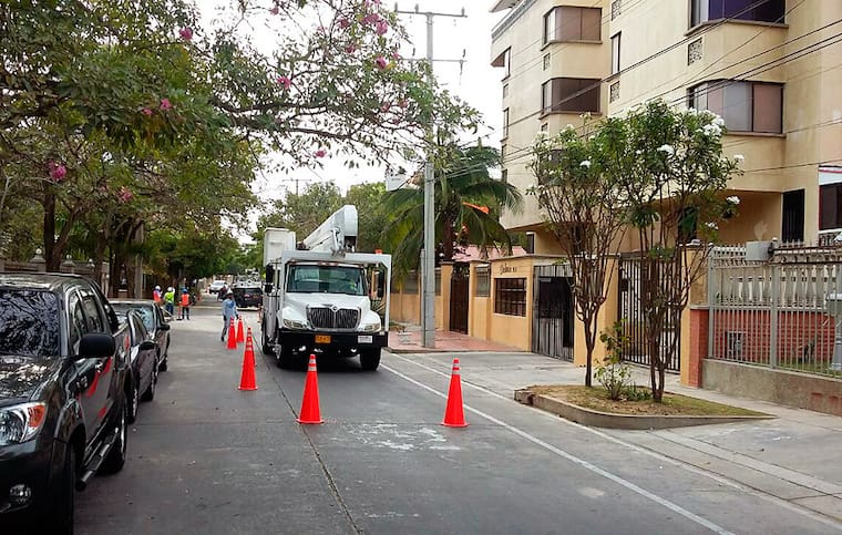 Operarios de Electricaribe realizan mantenimiento de redes en un sector de Riomar.