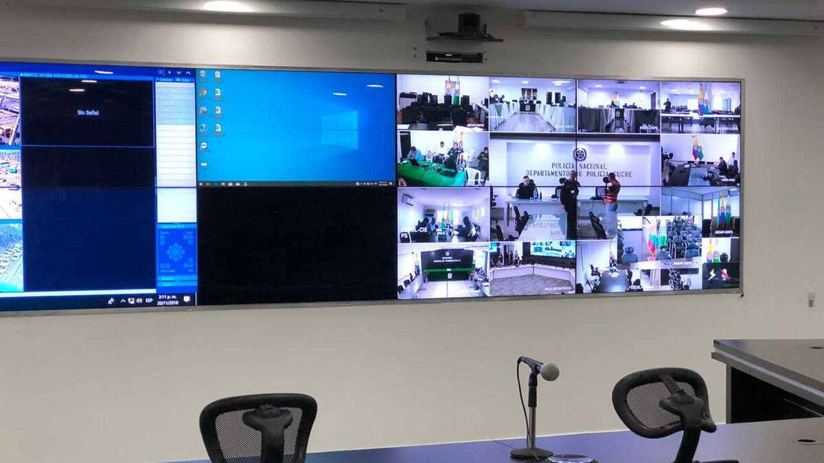 Esta sala está equipada con un monitor de más de 80 pulgadas divididas en varias ventanas que tienen conexión directa con las cámaras de seguridad de la ciudad, además de los drones.