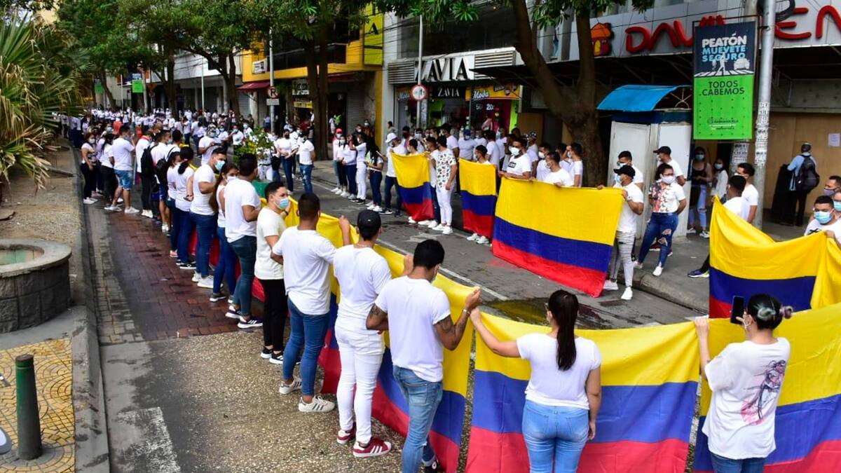 Desde las ocho de la mañana, los manifestantes se tomaron la calle 34 entre carreras 43 y 44, en el Paseo Bolívar, formando un camino de personas vestidas todas de blanco para simbolizar la paz y armonía.