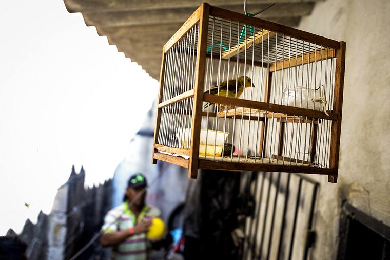 El canario Sebastián vigila desde el techo a Miguel, mientras este empieza a sacar manojos de trapos y algodón de una bolsa negra en el callejón de su casa. Allí, en metro y medio de estrechez, tiene un escaparate que usa como mesa de trabajo. Al lado de la batea donde lava la ropa.