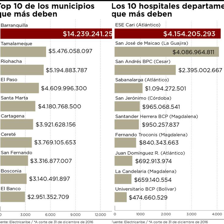 El presidente de la empresa, sin embargo, enfatizó en que hay entidades 'buena y mala paga'. Entre los casos 'más negligentes', por ejemplo, Electricaribe registra en Bolívar a las alcaldías de San Cristóbal, Santa Rosa de Lima, Córdoba Tetón, El Guamo, Cicuco, Pinillos y San Fernando y El Peñón, a los cuales se les adelanta acciones de tipo jurídico.