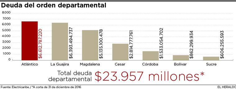 Las cifras evidencian que el 95,8% de los municipios (187 de 195) de la Costa tienen deudas con la empresa de servicios de energía. En Atlántico todos (23) registraban hasta el 31 de diciembre en la lista de deudores; En Bolívar 43 de 46, Cesar con 21 de 25, todas las Administraciones (30) de Córdoba, 14 de 15 en La Guajira; y todas las de Magdalena (30) y Sucre (26).