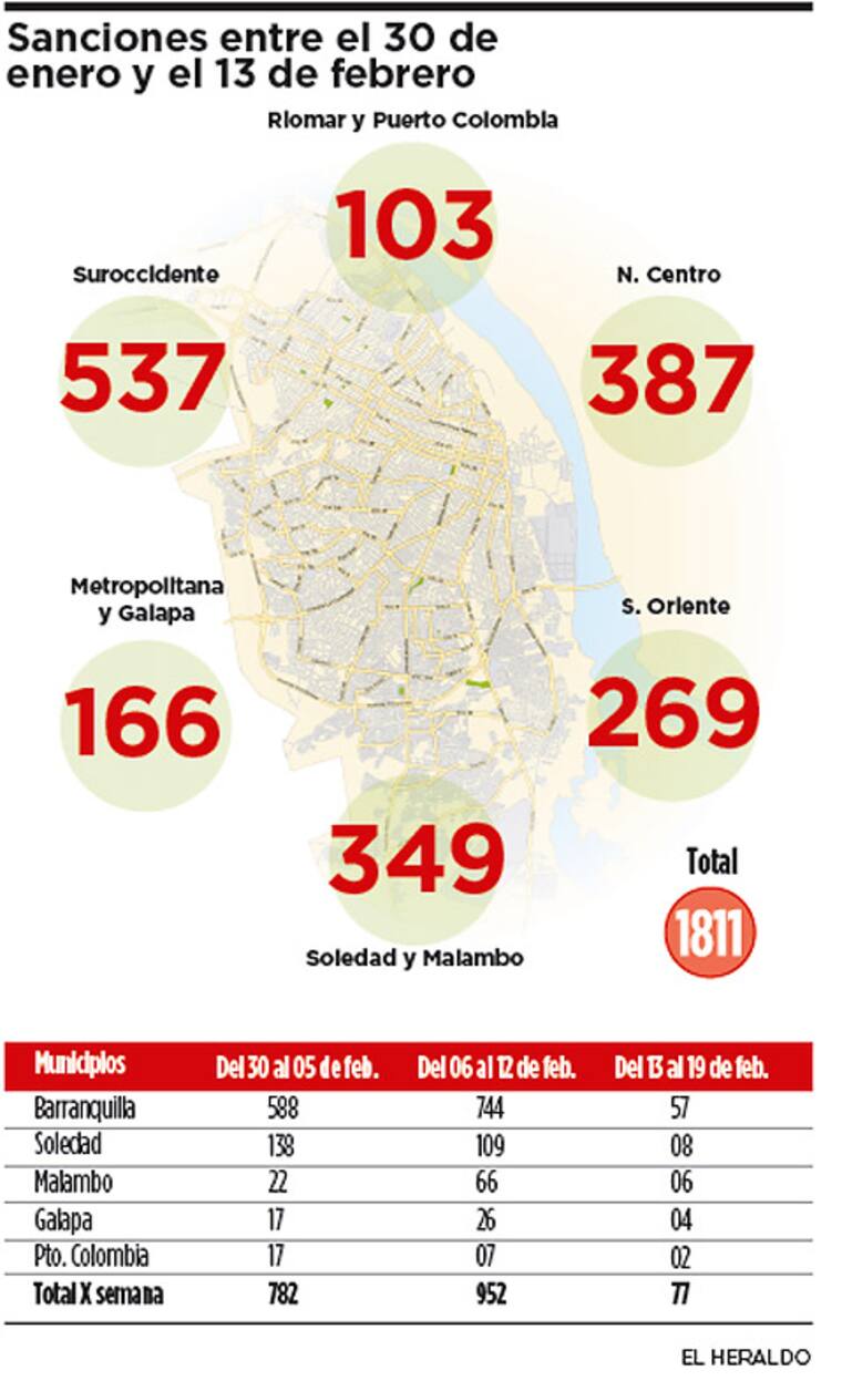 La primera semana que empezó a aplicarse, del 30 de enero al 5 de febrero, se impusieron en Barranquilla 588 comparendos, en Soledad 138, en Malambo 22, en Galapa 17, en Puerto Colombia 17. En total fueron 782.