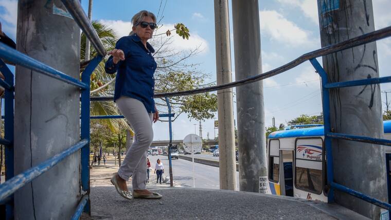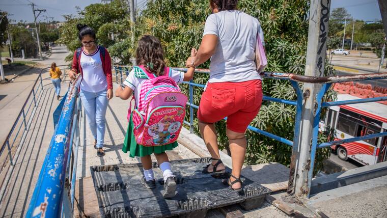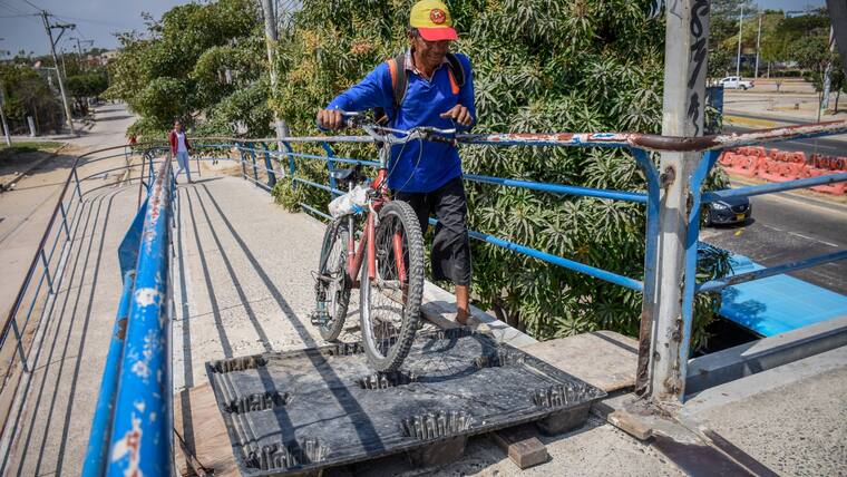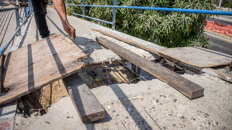 El panorama del puente peatonal del Metropolitano (Circunvalar) la mañana de este lunes era el de una larga fila de personas que intentaban atravesarlo, esquivando el enorme hueco que tiene la estructura. Una tabla de triplex alcanza a “medio cubrir la trampa mortal”, que la misma comunidad puso para evitar una tragedia. El Distrito anunció la reparación de la esctructura.