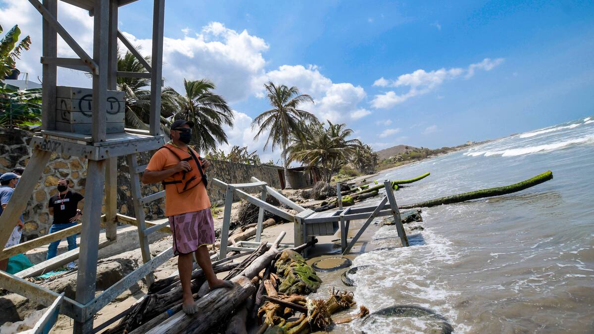 Las aguas se han consumido casi 20 metros de la playa, causando afectaciones en la infraestructura de algunos comercios. Incluso, ha tumbado palmeras mientras que las torres de salvavidas han quedado en la orilla junto a pilas de basuras y palos de maderas que llegan procedentes del río Magdalena.