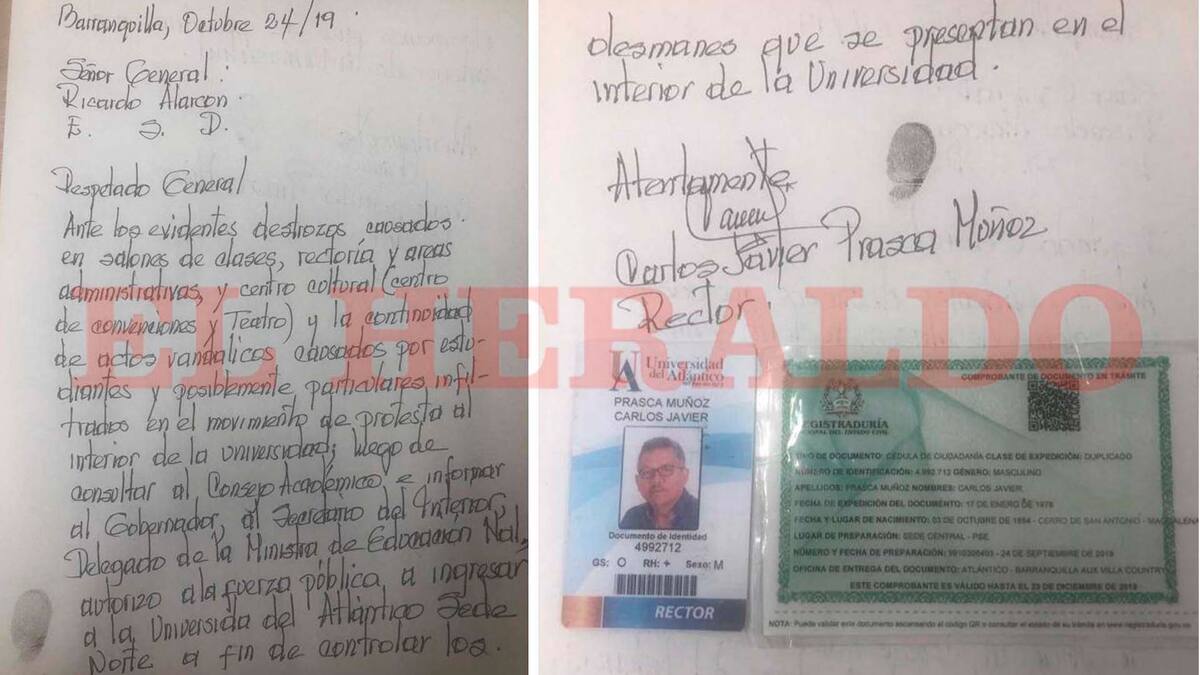 Con una carta dirigida al comandante de la Policía Metropolitana de Barranquilla, general Ricardo Alarcón, el rector de la Universidad del Atlántico, Carlos Javier Prasca Muñoz, autorizó el ingreso de la fuerza pública al campus universitario.