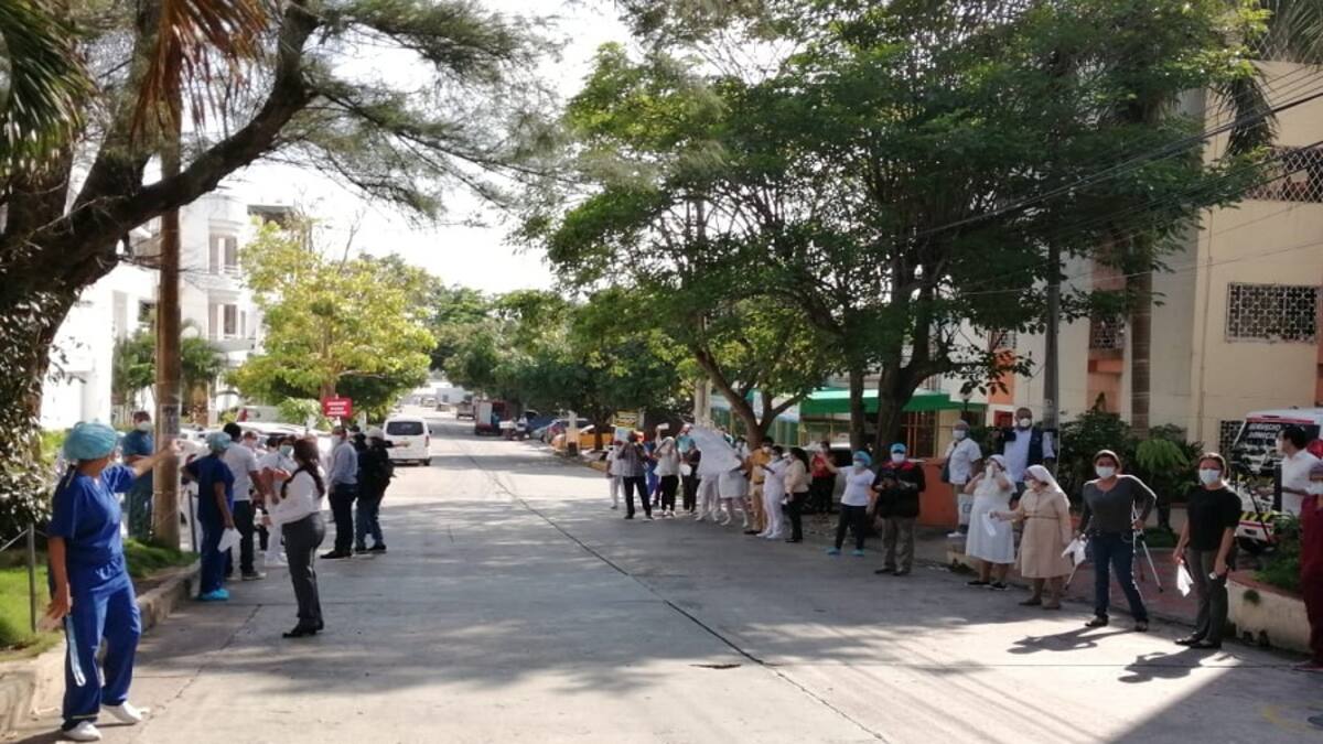 Ondeando pañuelos blancos, los trabajadores de este centro asistencial se apostaron a lado y lado de la calle –guardando la distancia social– para participar de una calle de honor para el galeno.