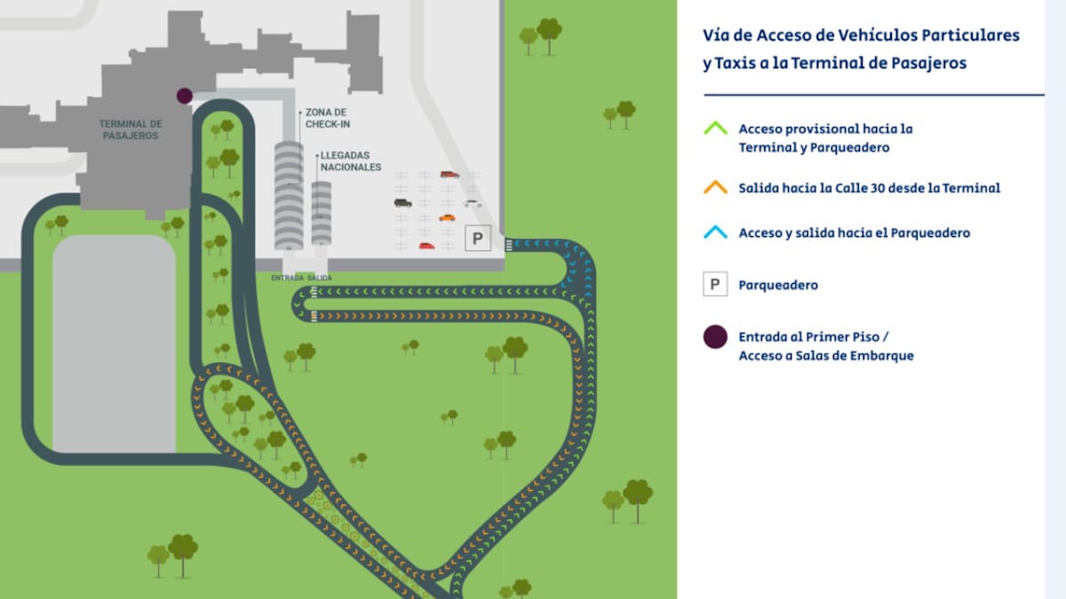 Por lo anterior, el usuario que ingrese en vehículos particulares o de servicio público para estacionar en el parqueadero, recoger a un pasajero que arribe en un vuelo o realizar trámites de chequeo para su posterior salida en vuelos domésticos o internacionales, deberá ingresar por el acceso único ubicado sobre la calle 30, recorrer unos 200 metros y luego virar a la derecha e incorporarse a la nueva vía interior, que tendrá una longitud aproximada de 220 metros y que, en su contexto, conforma un circuito vial con un retorno emplazado frente al acceso principal de la terminal satélite (Ver plano anexo Acceso de vehículos particulares).