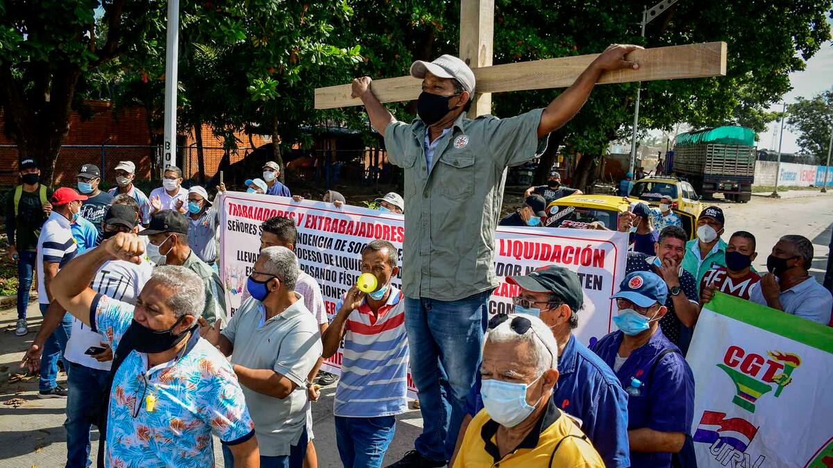 'Crucificados' en una cruz artesanal, extrabajadores de la empresa Pizano S.A, liquidada en el año 2018, se plantaron este lunes en horas de la mañana a las afueras de la sede de la entidad con el objetivo de realizar una manifestación en la que reclaman a la Superintendencia de Sociedades sus derechos laborales, asegurando que 'han sido violados' por el liquidador encargado del caso.