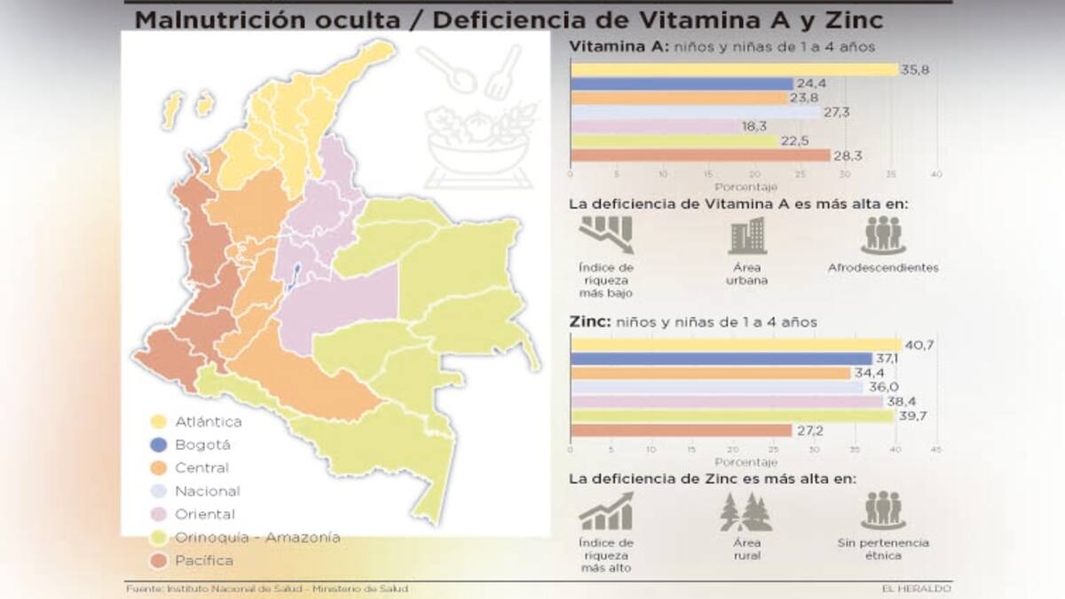 De acuerdo con las cifras del INS, el 35,8% de los menores entre 1 y 4 años de la Región Caribe tienen deficiencia en Vitamina A, más de 7 puntos porcentuales por encima de la región Pacífica, segunda en el ranking con el 28,3% de deficiencia en esta vitamina. (Ver infografía)