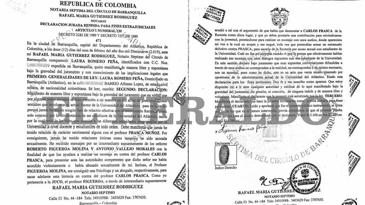 Un documento notariado que contiene la declaración jurada de la estudiante Laura Romero Peña, supone la prueba reina que el rector de la Universidad de Atlántico, Carlos Prasca, tiene bajo la manga para defender su inocencia ante las denuncias sobre el supuesto acoso sexual.